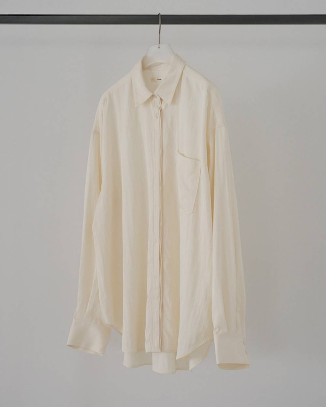 しなやかで軽い着心地が魅力のオーバーシャツ。リラックス感あるラフなシルエットで、一見シンプルに見えますが、細かなステッチワークにも注目していただきたい、ディテールにこだわった一枚。襟やヨーク、ポケットは細めのダブルステッチに、アームホールやカフスは3本ステッチを効かせています。立体的に仕立てた前立ては、台襟と第一ボタンのみ表から見える仕様にし、ボタンの留め方でフロントの印象が変化するのもポイント。着るだけでスタイリングに奥行きが生まれ、幅広いアイテムに馴染む一着。 size:着丈80.5cm 肩幅60cm バスト145cm 袖丈59cm 袖ぐり55.4cm 裾幅71cm material:【本体】レーヨン72% ナイロン28%
