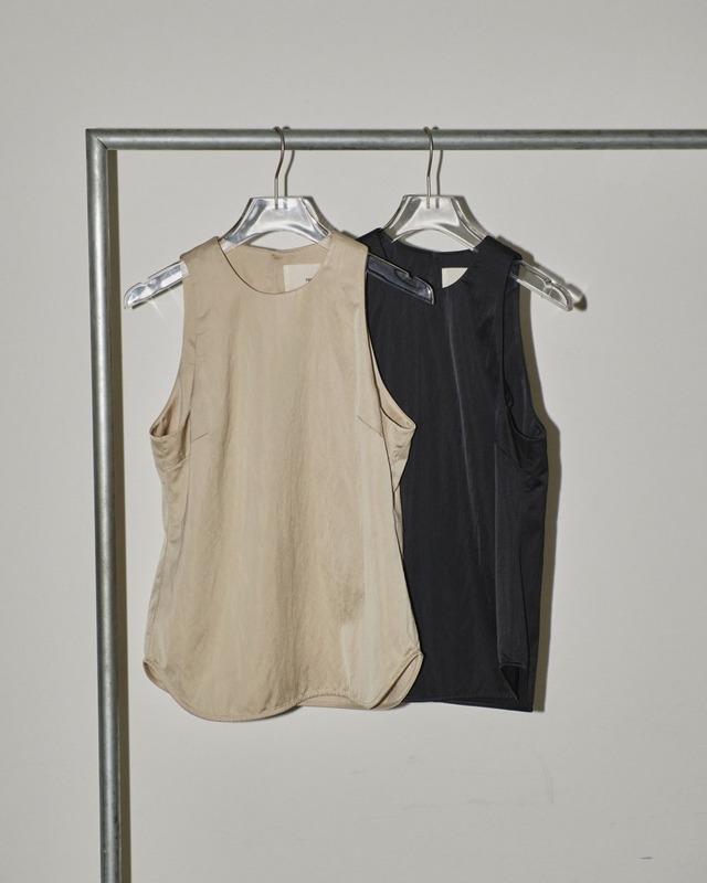 ほどよく厚みがあり、繊細な表面感が魅力のサテントップス。アームホールや襟ぐりの表にステッチを出さず、全体的にミニマルに仕立てた一枚。ぴったりとした襟ぐりラインやアメリカンスリーブラインと生地感との相性が絶妙で、どんなボトムスに合わせてもこなれた印象に見せてくれます。同じ生地を使用したSatin Drape Skirtsとセットアップでも着ていただけます。 素材: レーヨン57% ナイロン40% ポリウレタン3% サイズ :FREE着丈60cm肩幅25cmバスト88cmアームホール23cm裾幅50cm