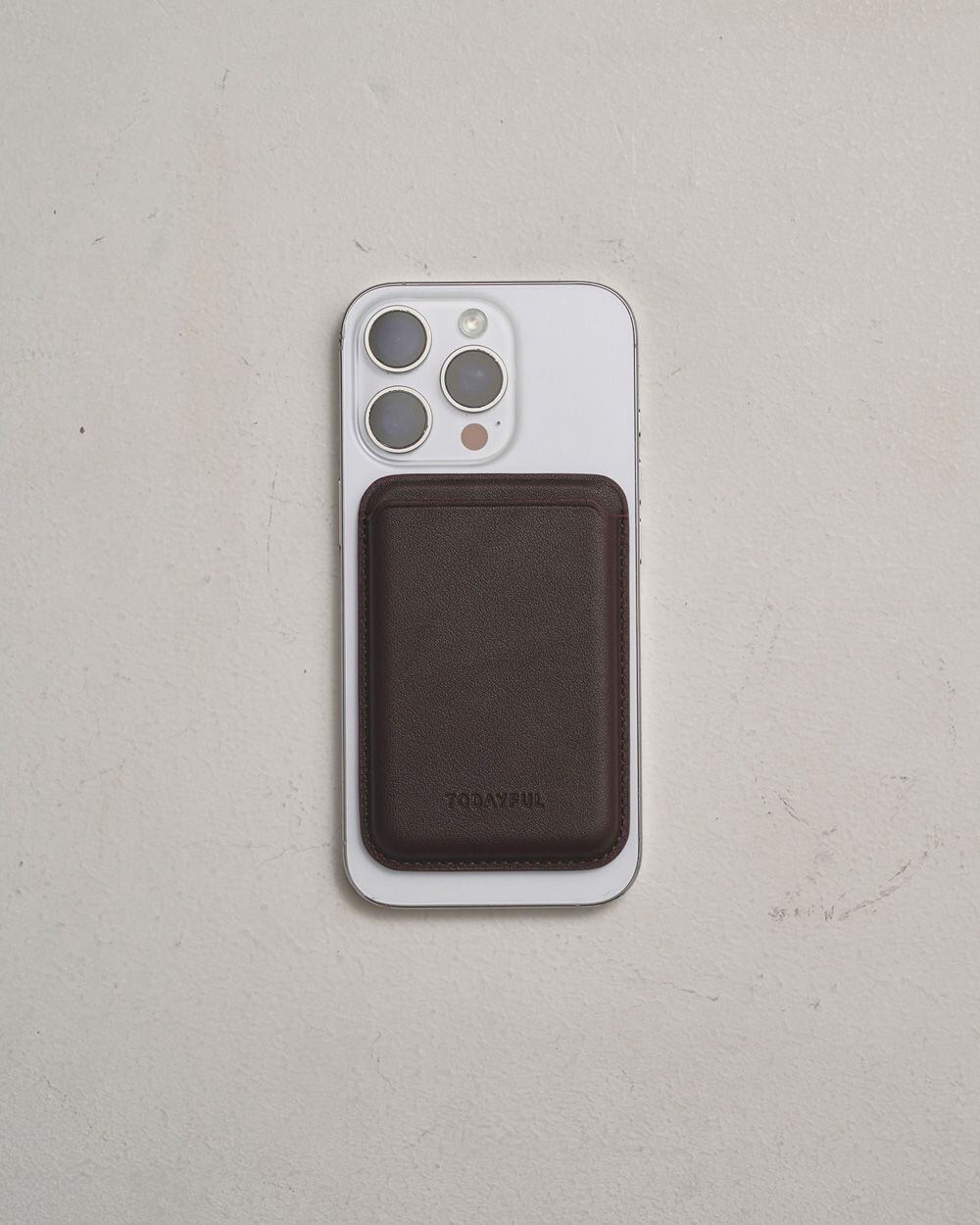 ミニマルなデザインが魅力のマグネットポケットケース。背面にクレジットカード・ICカードが収納できるスリムなポケット付きで、これひとつで身軽に外出できる便利なアイテム。マグネットでしっかり固定でき、着脱もスムーズ。バッグに頼らずスマートに持ち歩きたい方におすすめです。