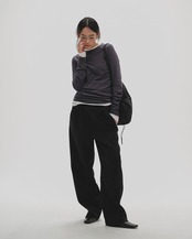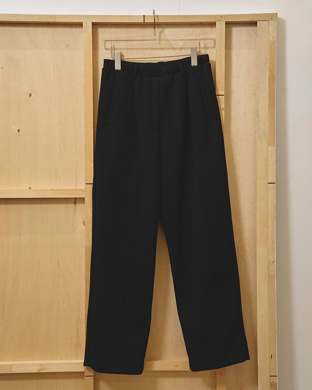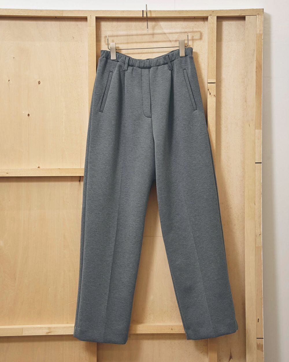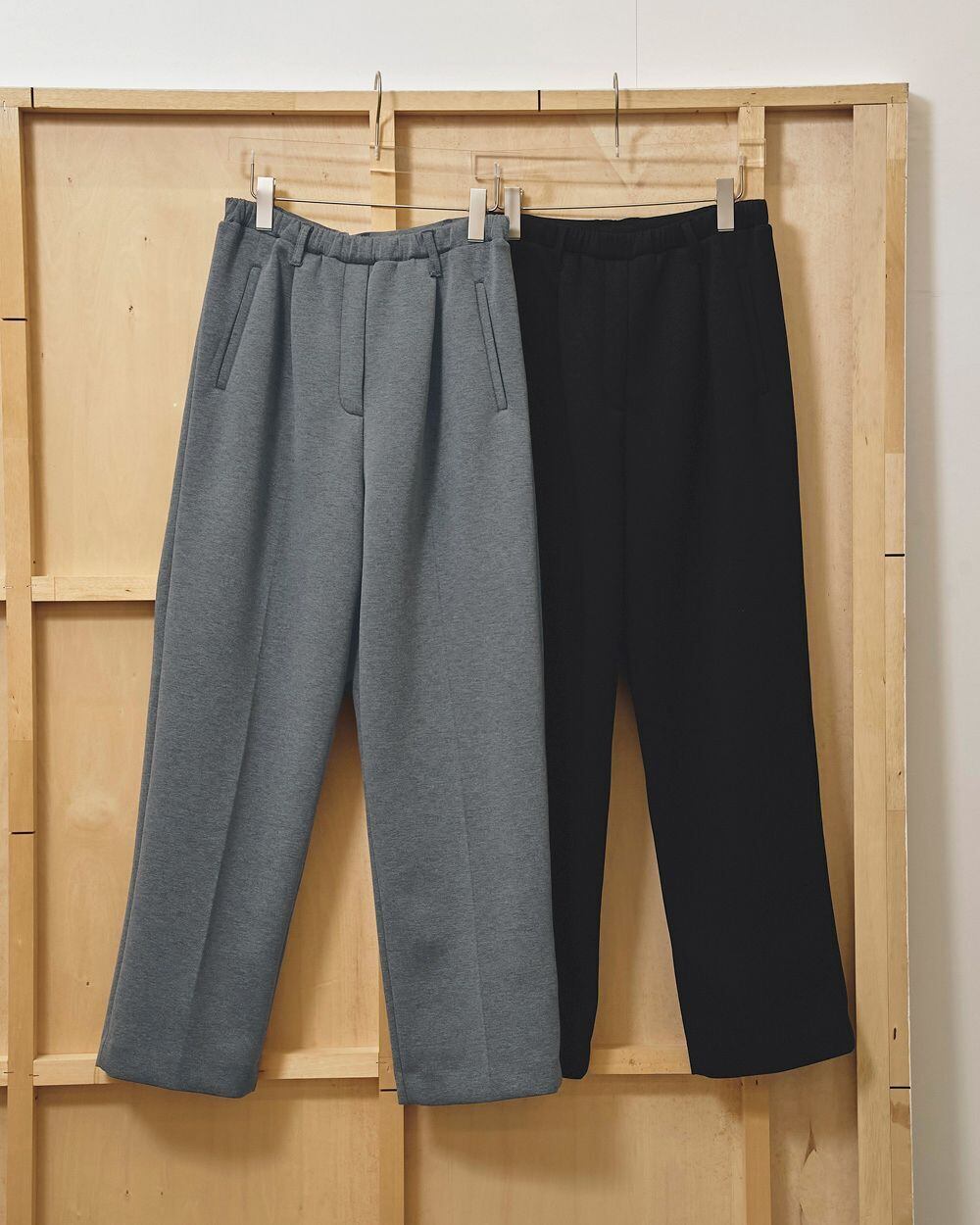 国内の上質なダンボール生地を使用したトラウザーズ。スポンジを挟み込んだ様なクッション性と、ふっくらとハリのある風合いが魅力。履き心地のよさと、履いた時のきれいなシルエットを実現。ウエストはゴム仕様で内側にはドローコードも通っており、サイズ調節が可能です。スニーカー合わせはもちろん、ヒールを合わせたキレイ目なスタイルもおすすめです。