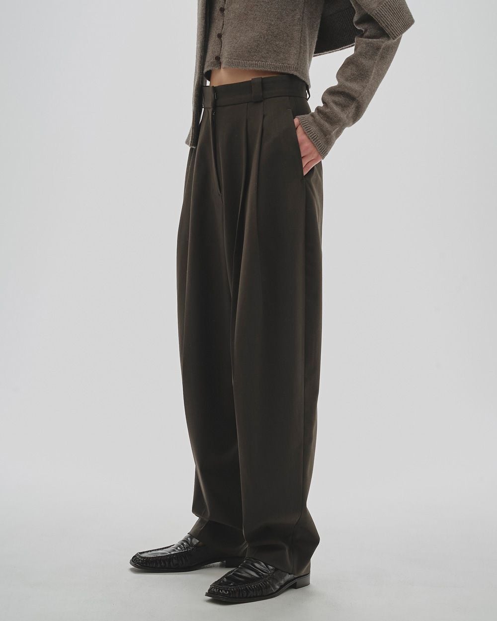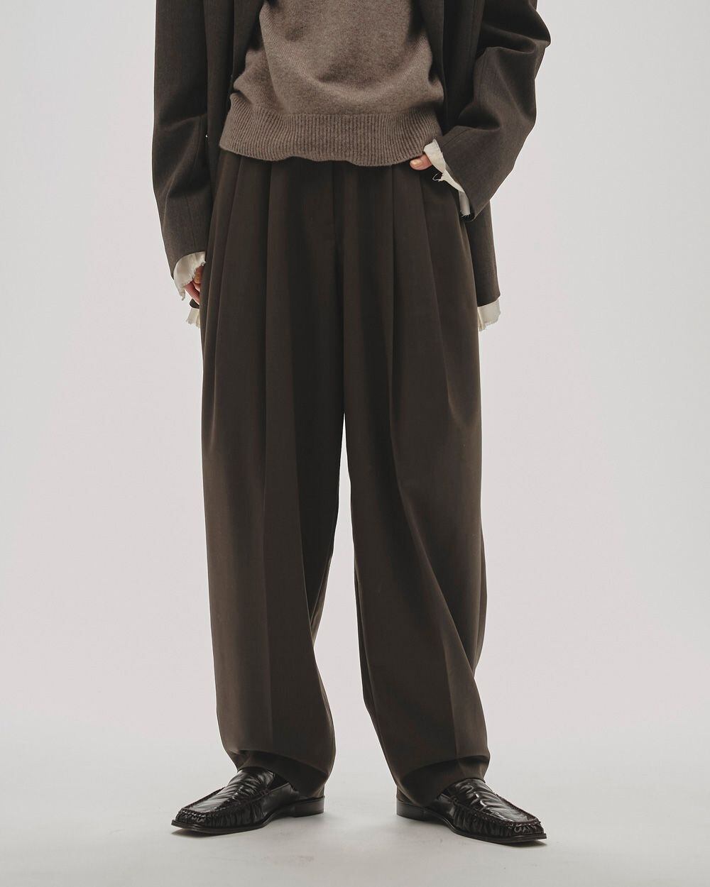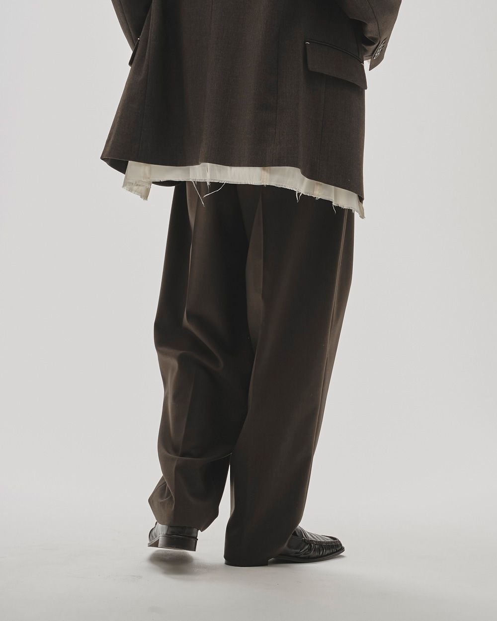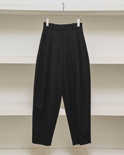 国内の上質なツイル生地を使用したトラウザーズ。深めのタックや太めのベルトループ、ボリューム感のあるテーパードシルエットが魅力。ストレッチ性があり履き心地の良さも抜群な一枚。カジュアルなスタイリングはもちろん、上品でマニッシュな雰囲気のスタイリングにも馴染むアイテムです。
