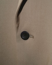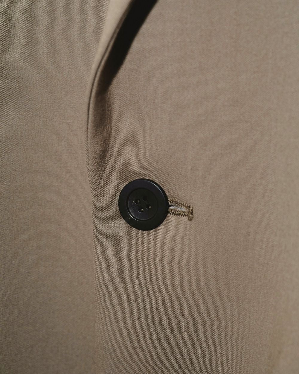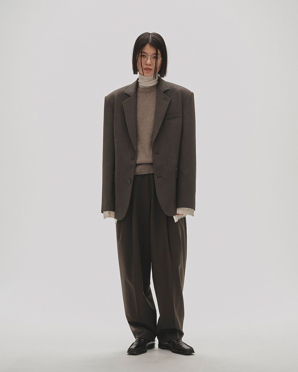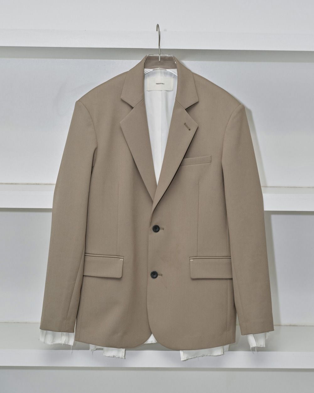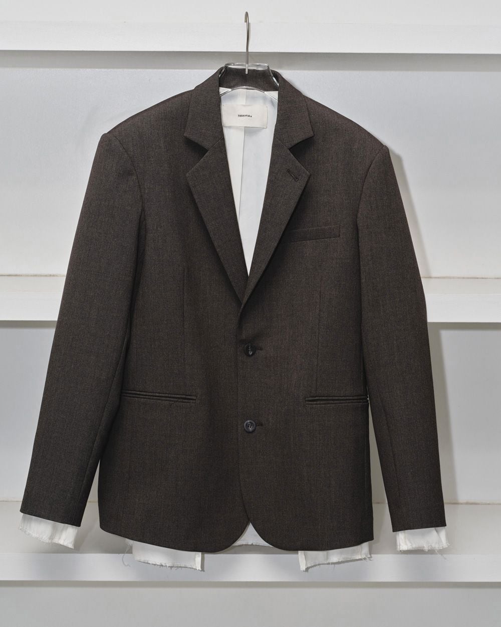 杢調で上品な質感の生地を使用したジャケット。厚みのある肩パッドで、オーバーシルエットなデザインがマニッシュ。裾や袖口からのぞく、カットオフ仕様の裏地が目をひく一枚です。