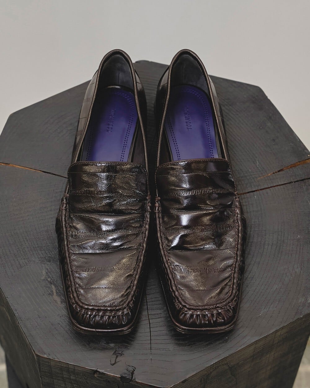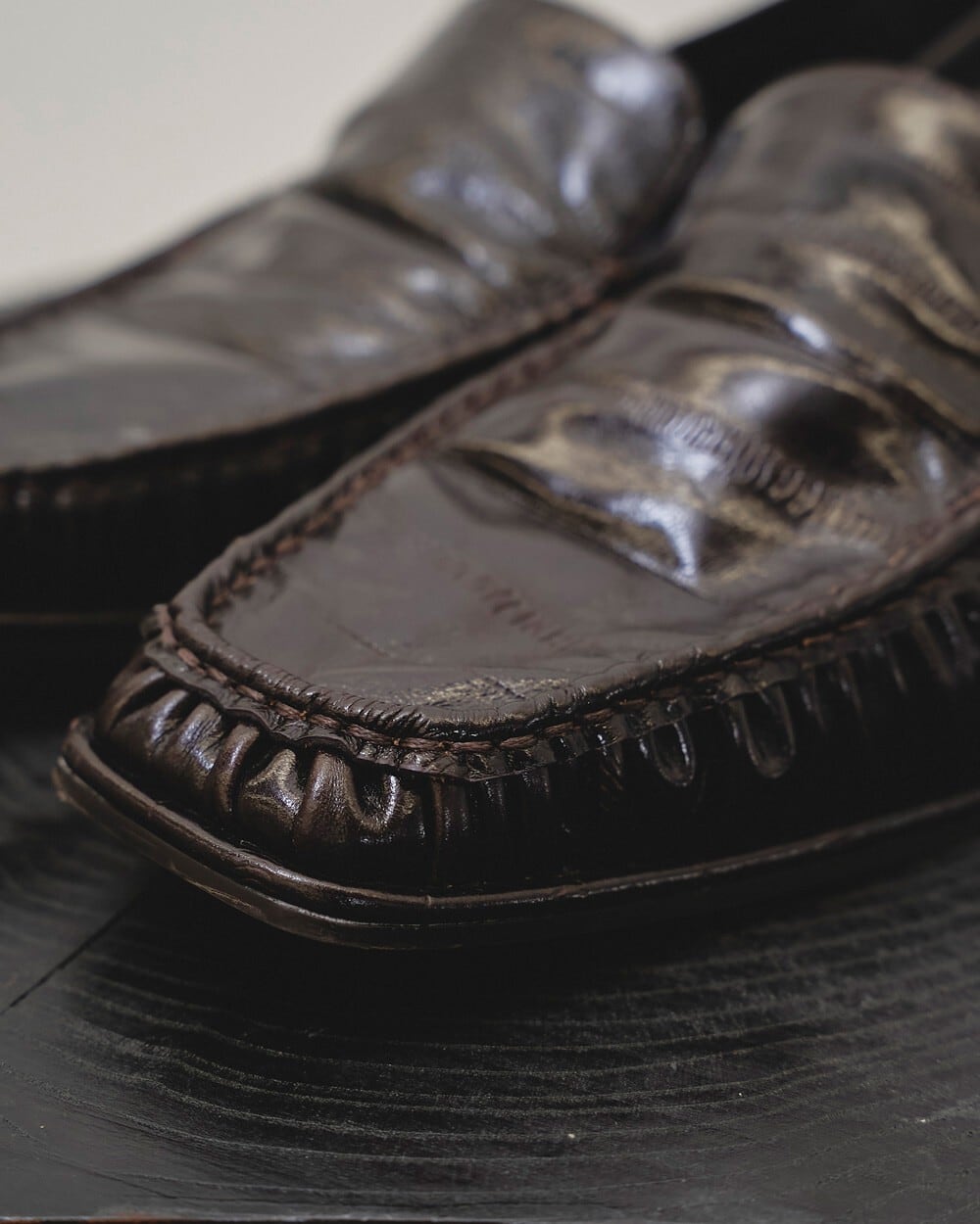 特殊な加工を施した牛革を使用したローファー。上品な光沢のある表情感豊かな牛革にふんだんにあしらったギャザーやステッチワーク、柔らかな履き心地が魅力。色味に奥行きのあるダークブラウンカラーで、ボトムス合わせはもちろん、ソックスを合わせたワンピースやスカートスタイルにも馴染みます。デイリーからオケージョンまで幅広く活躍する一足です。
