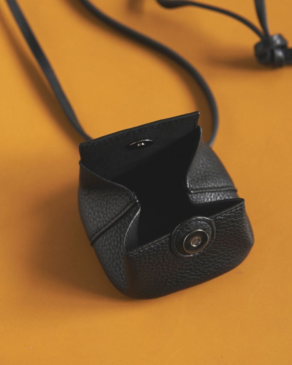 シボ感のあるエコレザーを使用したミニポーチ。2タイプの共布紐付き。長い紐は、首からかけたりウエストに巻いたり、スタイリングのアクセントとしておすすめ。短い紐は、そのまま手に持ったり、バッグにチャームのように付けていただけます。小銭を入れたり、リップなどすぐ取り出したい小物が入るくらいのミニサイズ。Volume Ball Bagと同素材です。