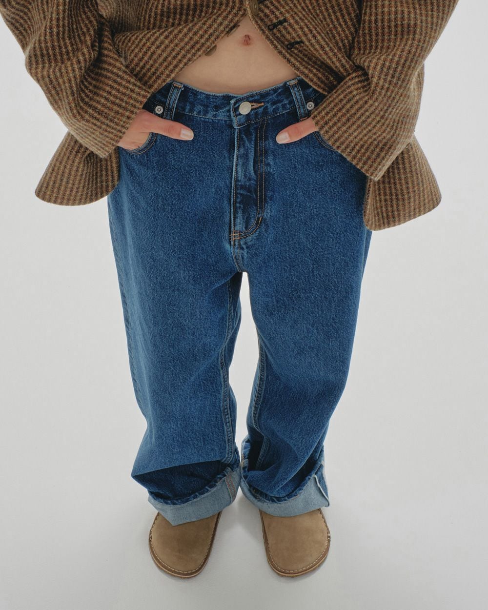 ストレートラインでルーズ感のあるシルエットが魅力のデニム。腰履きでマニッシュな雰囲気で履いていただくのがおすすめな一本。生地の端を贅沢に使用しているのため、裾を折り返しても履いていただけるように少し長めの着丈にしています。