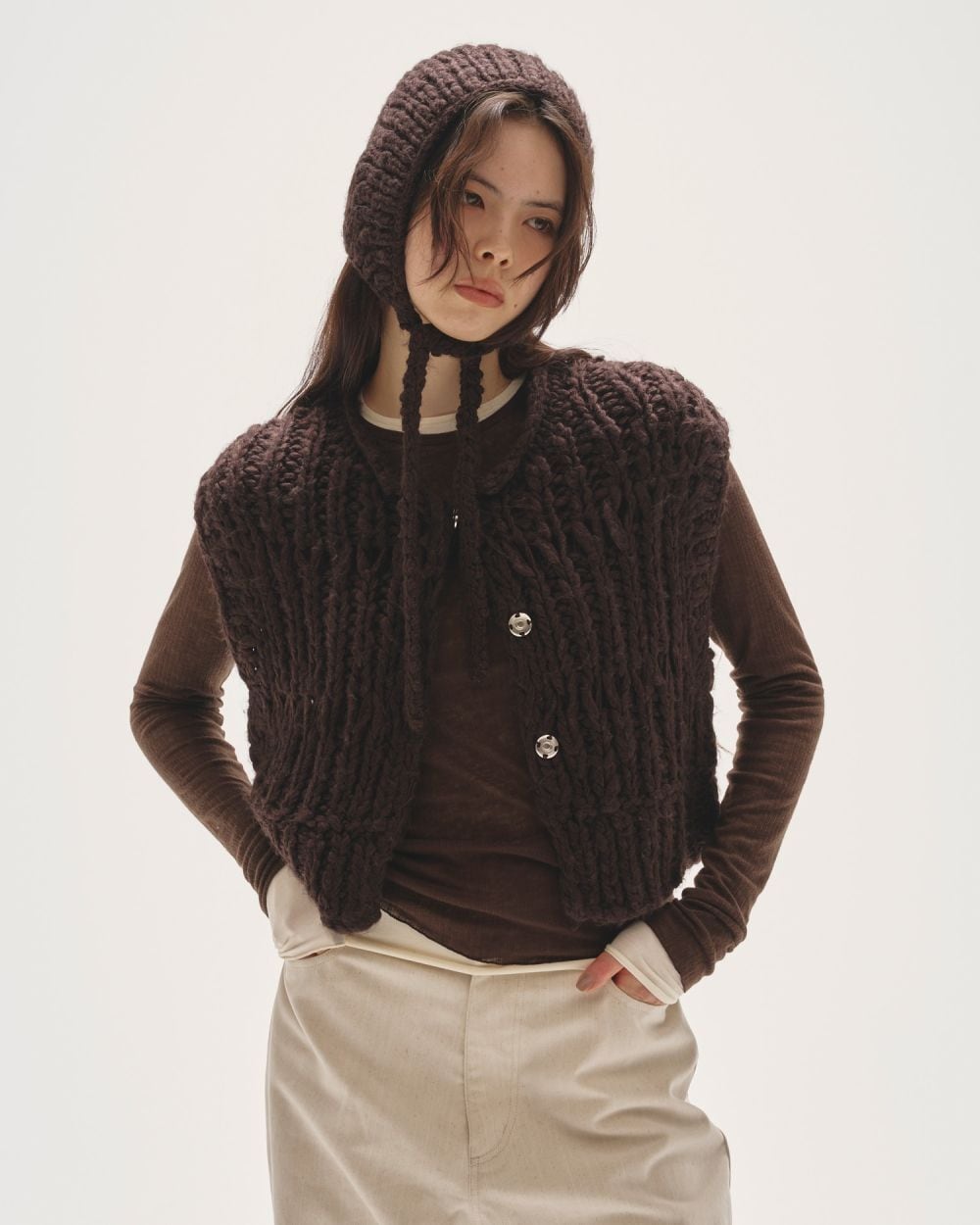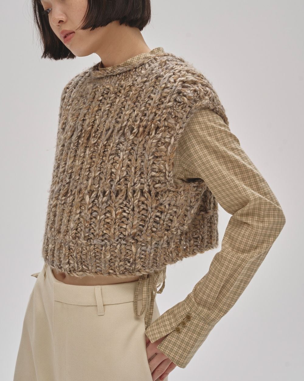イタリア糸を使用し、一つ一つ丁寧に手編みされたニットベスト。目をひくミックスカラーに加え、新色のダークブラウンはふっくらとした風合いの糸が魅力。手編みならではのゆるっとした編み目がシーズンムードたっぷりな一枚。カットソーやスウェットに重ねるのはもちろん、肌触りが柔らかく着心地も抜群なので、キャミソールの上にさらっと羽織るスタイルもおすすめ。前後2wayで着用できます。
