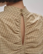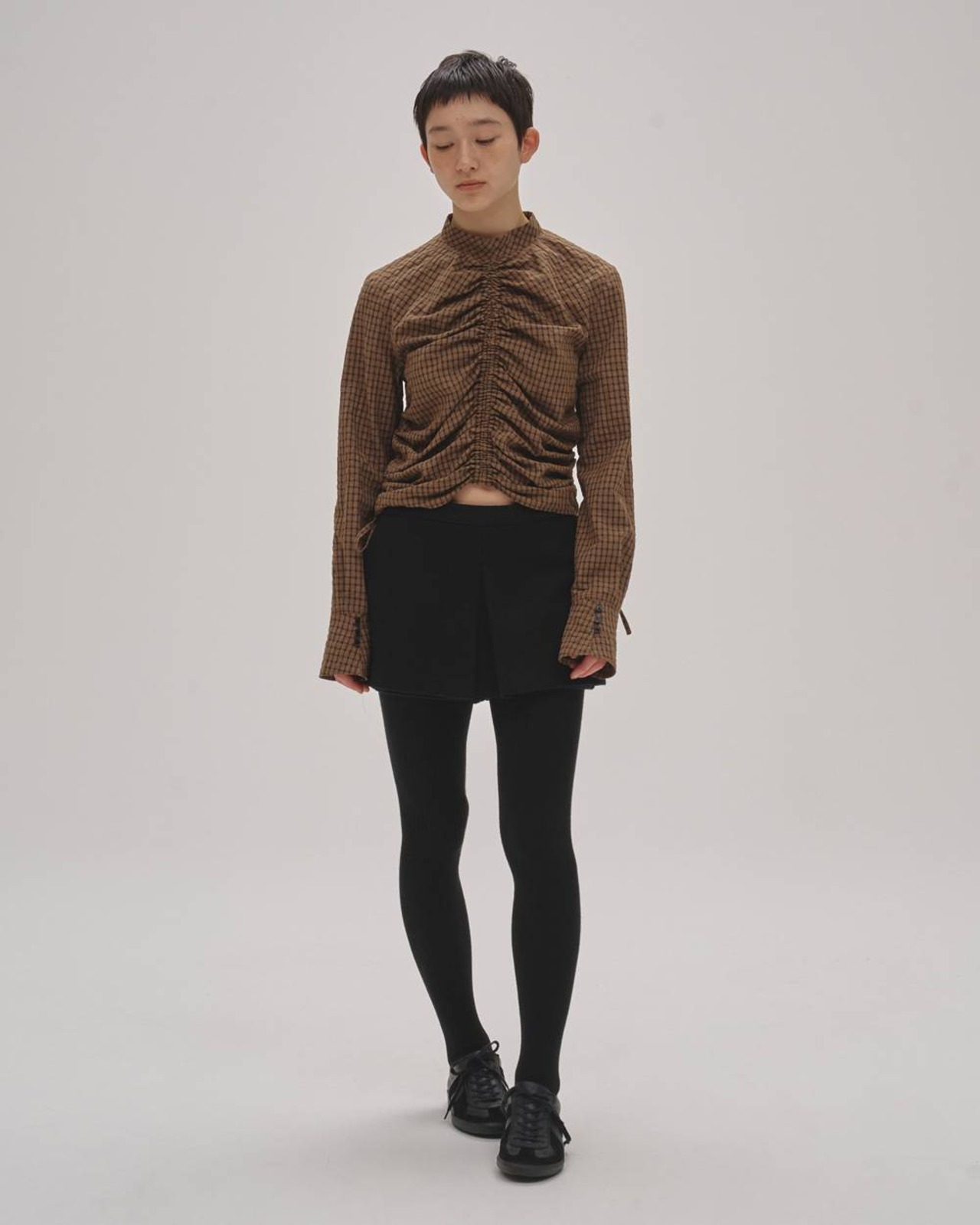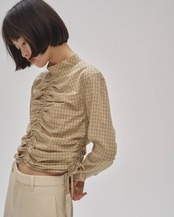 奥行きのあるチェック柄が目をひくブラウス。フロントとサイドに寄せたギャザーでふんわりとしたシルエットをつくり、コンパクトながら女性らしいバランスに仕上げました。シンプルなボトムスに合わせるだけで、華やかでこなれた印象に。