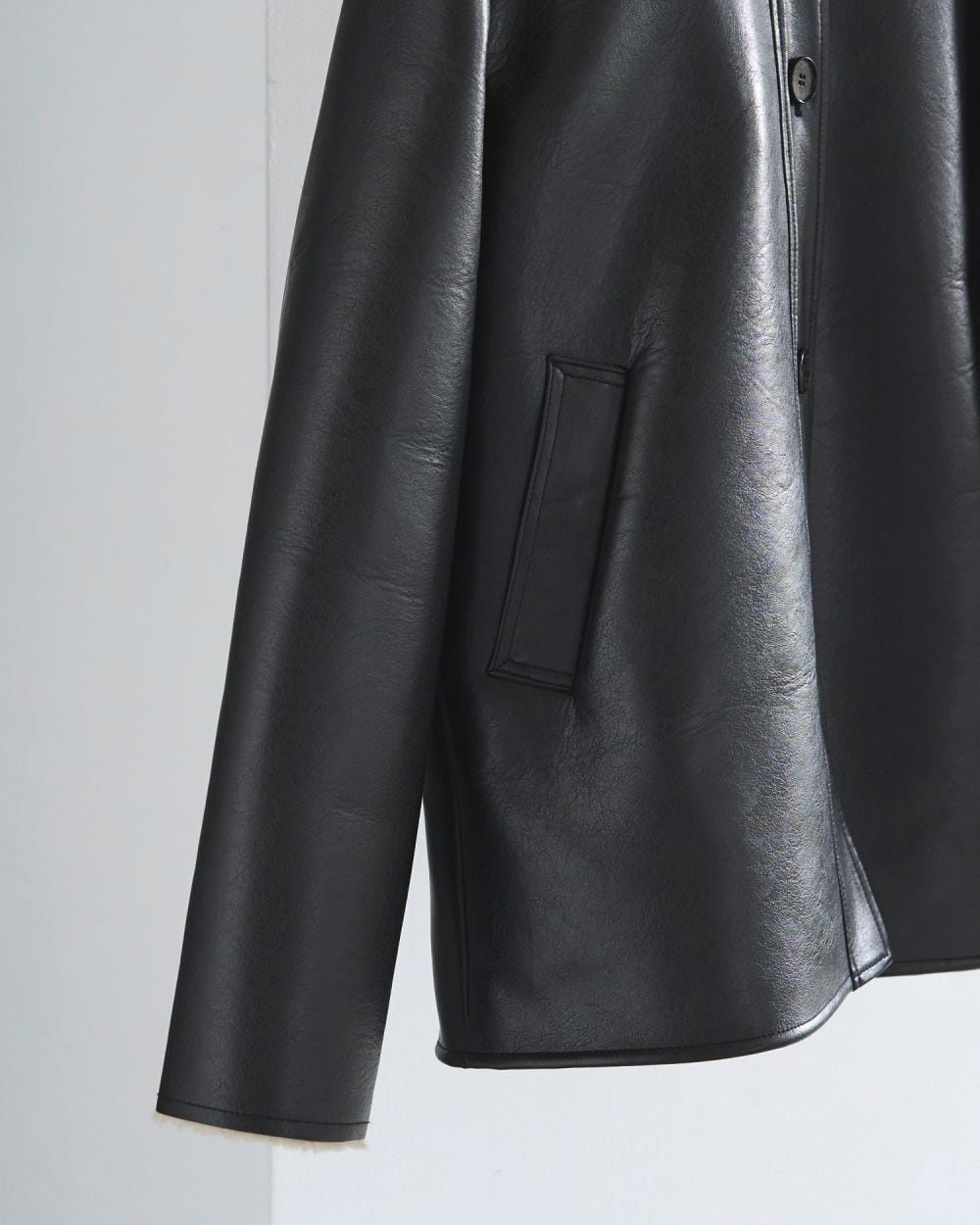 ボアカラーがポイントのエコシアリングジャケット。上品なシボ感と重厚感ある上質なエコレザーに、程良い粒感のボア素材をボンディングした生地です。フライトジャケットデザインとワイドシルエットでメンズライクに仕上げました。襟を立ててタブを留めて着るのもおすすめ。ボア面が首元を包み込み、寒い日も暖かく過ごしていただけます。