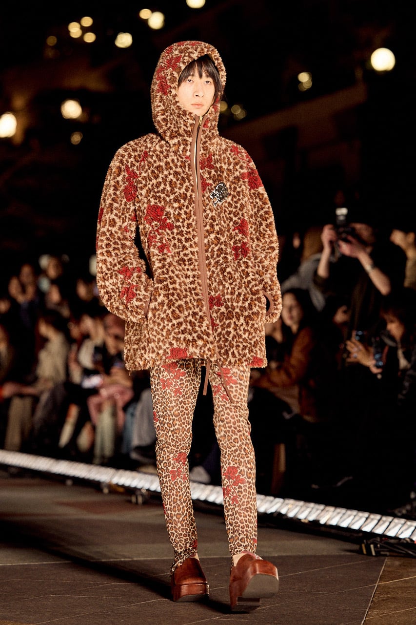 FUMIE=TANAKA フミエタナカのLEOPARD BOA FOOD F25A04(BROWN)。レオパード柄と華やかなフラワーモチーフが見事に調和したこのボアフードジャケットは、ボリューム感のあるデザインが特徴です。