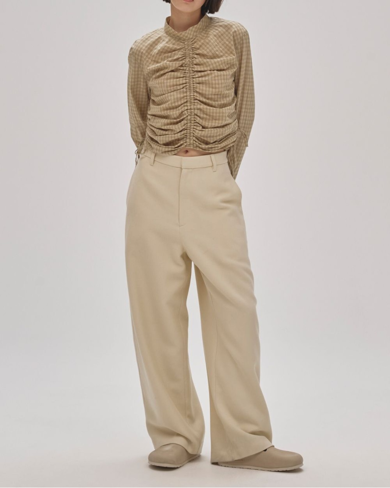 ウール特有の毛羽立ちを抑えた、滑らかで上品な表情の生地を使用したトラウザーズ。ほどよく落ち感がありつつも、シルエットを美しくキープしてくれます。ワイドシルエットにコクーンの丸みを加えた立体的なフォルムは、穿くだけでスタイリングに抜け感とモードな雰囲気をプラス。トップスを選ばず、幅広いシーンで活躍する一枚です。