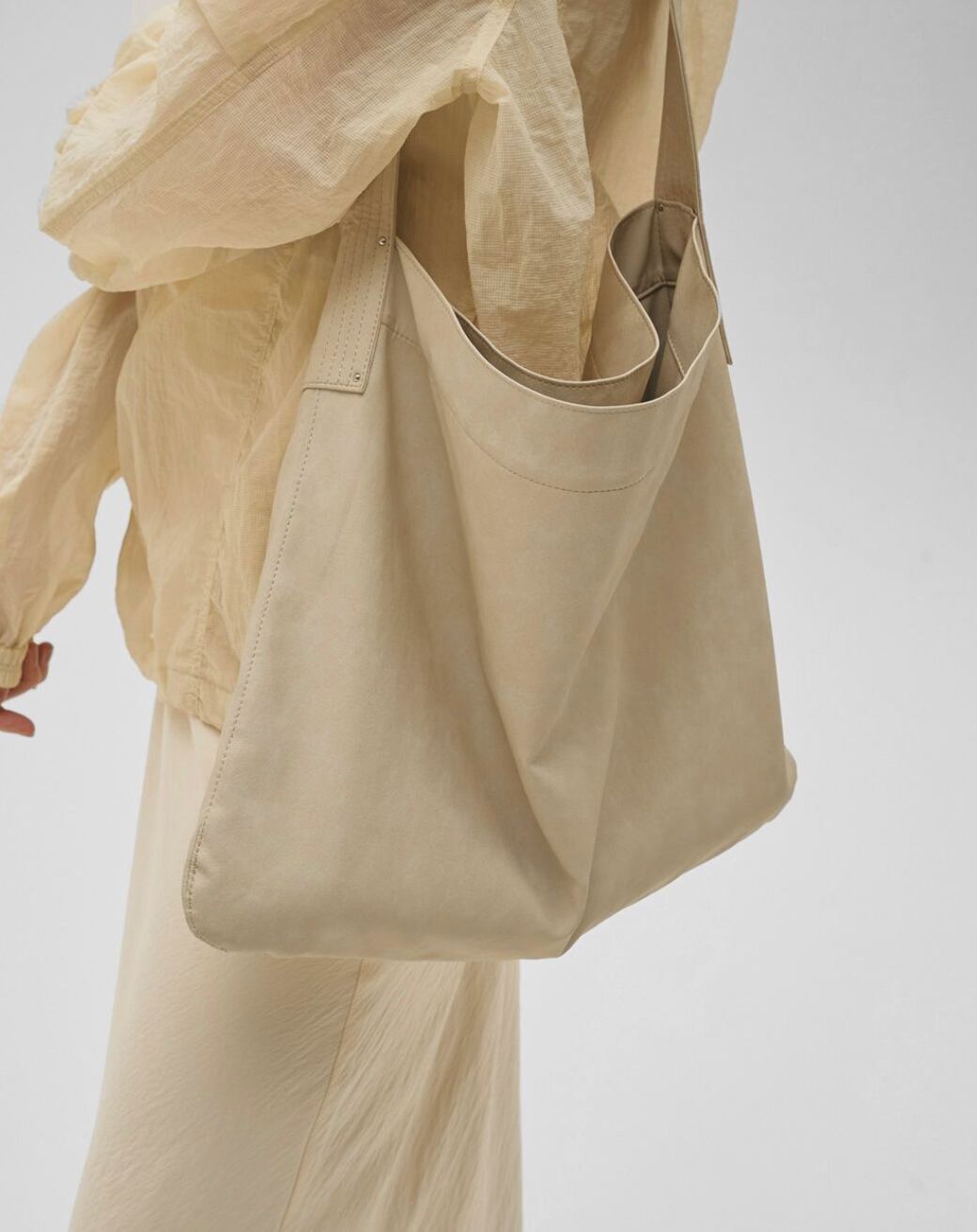 柔らかな風合いのレザー調素材を使用したショルダーバッグ。くったりとした質感がこなれ感をプラスし、スタイリングに自然と馴染みます。A4サイズもしっかり収まる容量でデイリーに使いやすく、細かいステッチを効かせた持ち手やサイドにあしらった小さなリベットなど、さりげないディテールもポイントです。肩掛けしやすいショルダータイプで、オンオフ問わず活躍してくれるアイテムです。