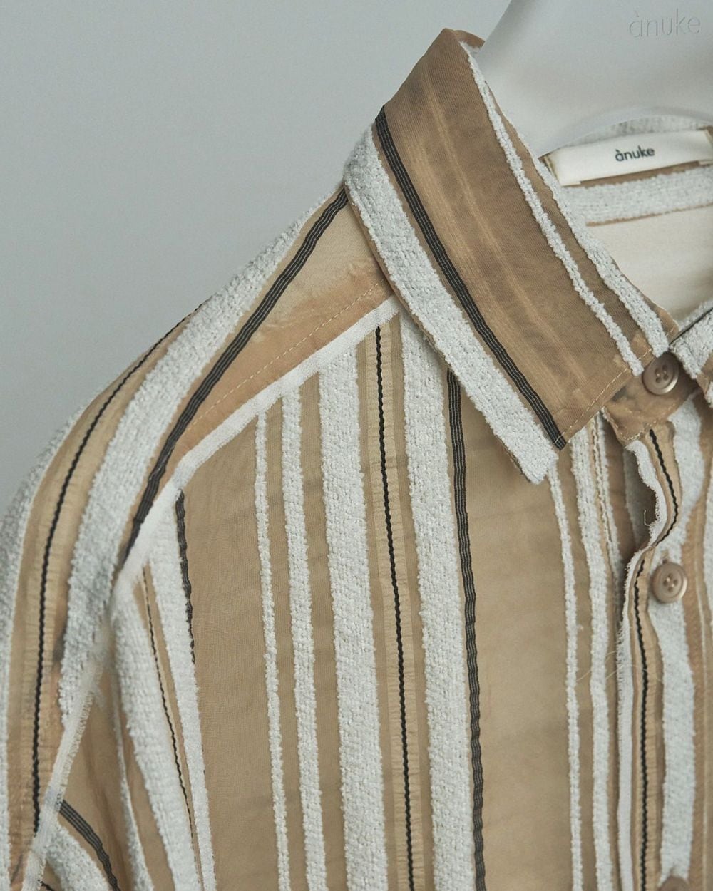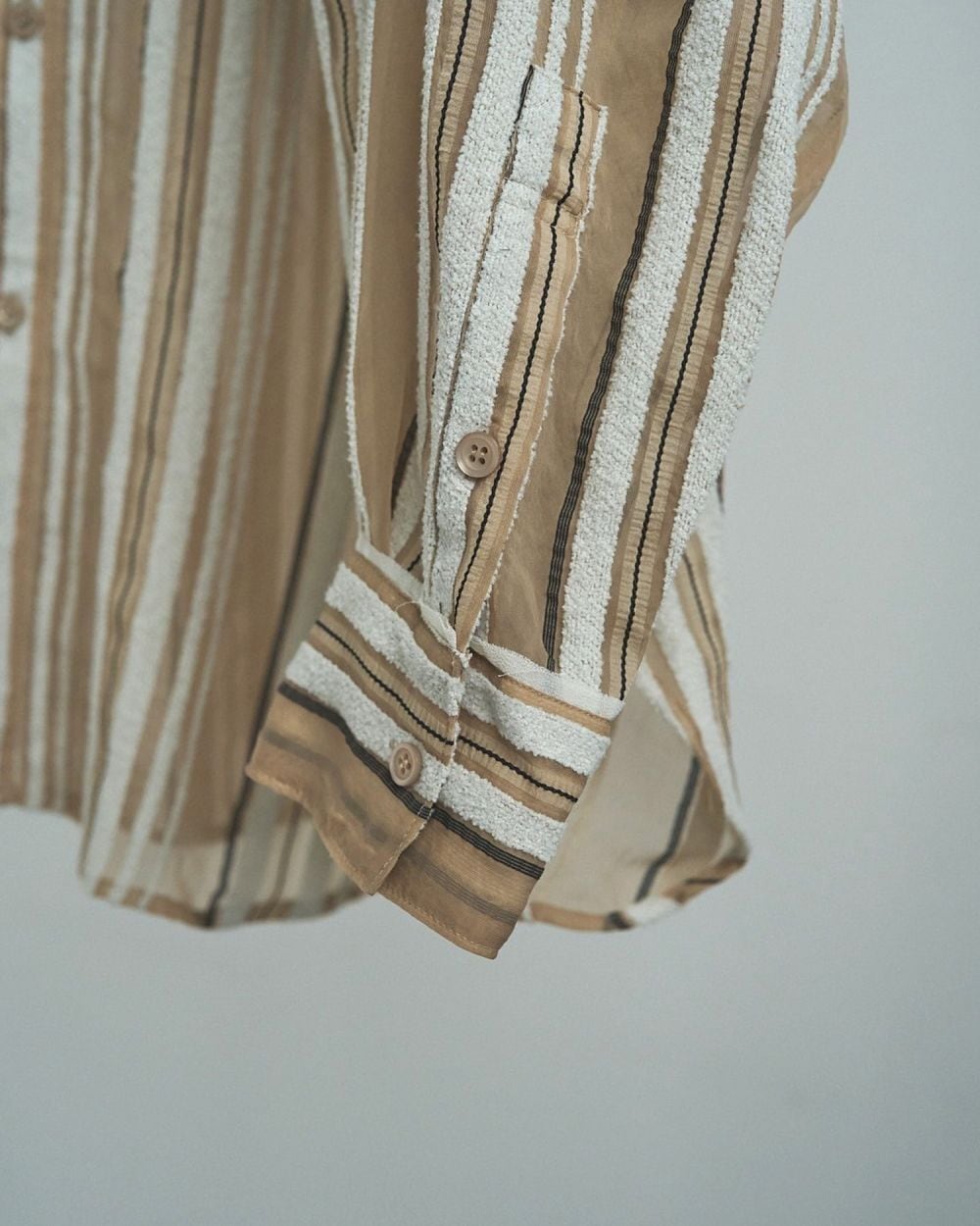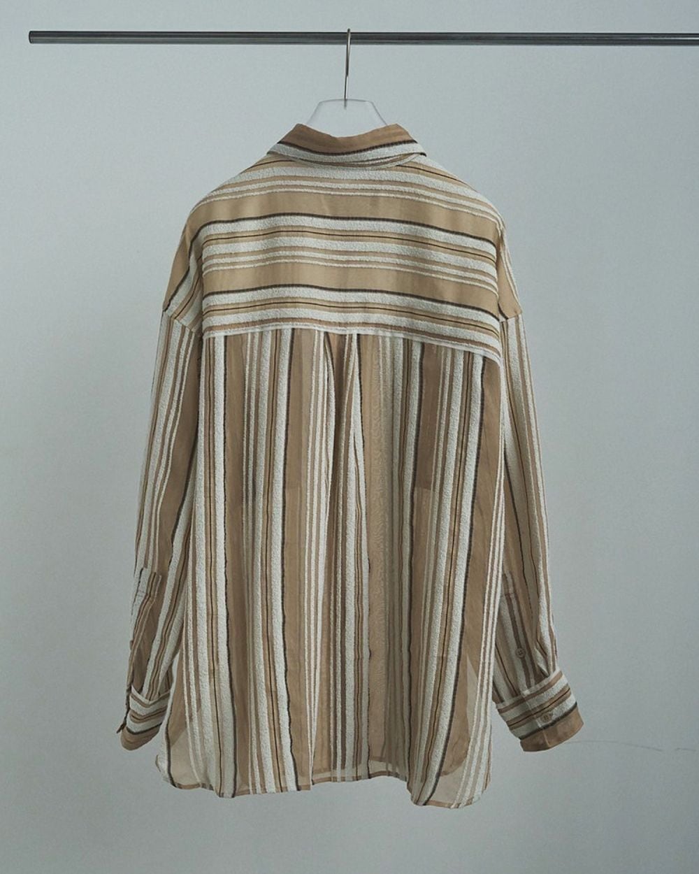 日本の桐生で織り上げたオリジナルのストライプ生地を使用したオーバーシャツ。全体はシアーに仕上げ、ライン部分はモールヤーンを使い立体的なストライプにしています。切り替え部分に、カットオフされた無地のシアー素材を挟み込んでいるのもポイント。ゆったりとしたサイジングの抜け感あるシルエットです。シンプルなボトムに合わせるだけで映える一枚です。