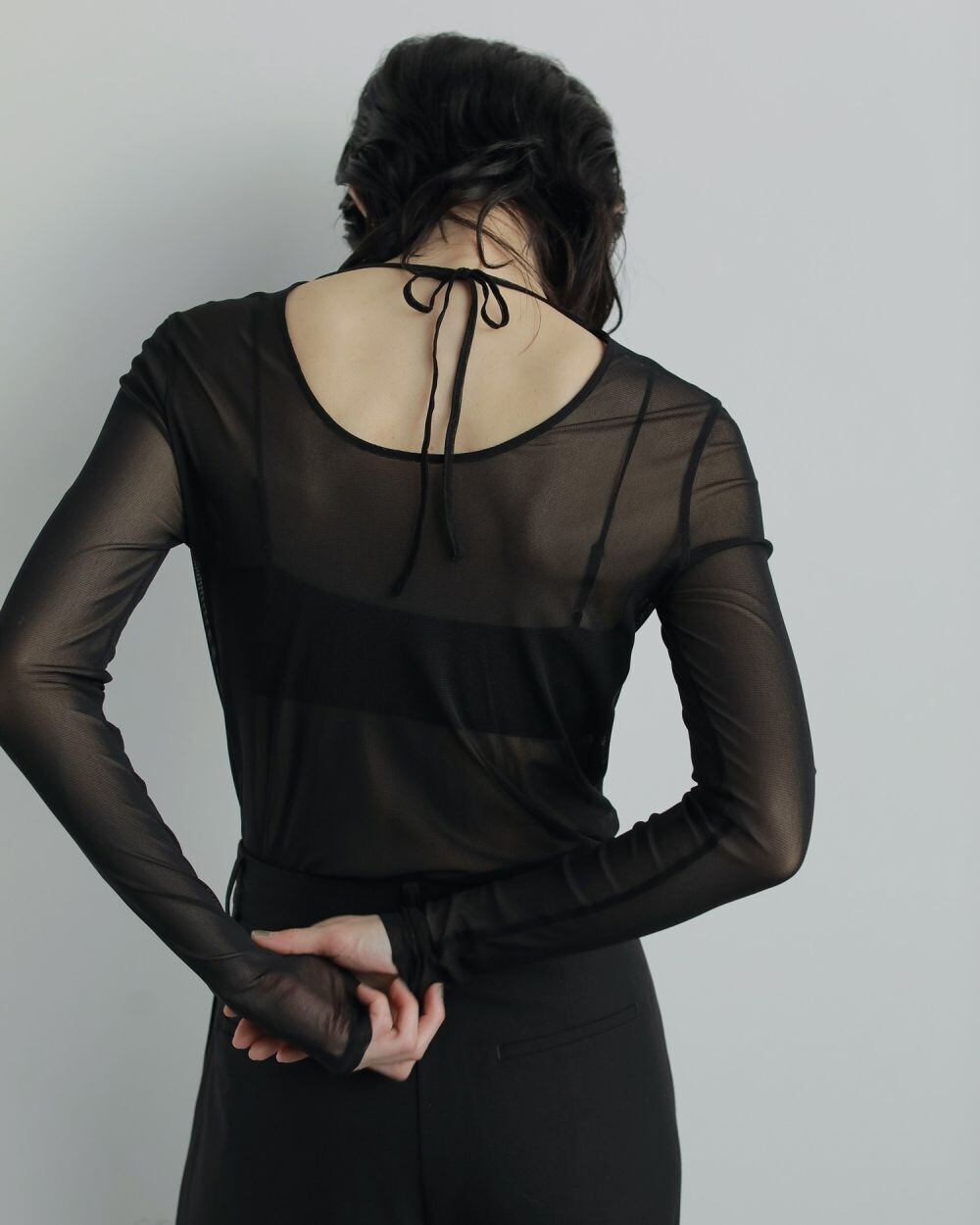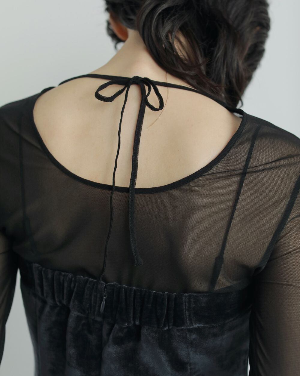 柔らかなストレッチチュールで仕上げたコンパクトトップス。深めに開いたUネックと首元の詰まったクルーネックと前後2WAYで着用可能です。襟ぐりのリボンも前後どちらで結べ、首元のポイントに。ワンピースやコンビネゾン、ビスチェとのレイヤードにもおすすめです。