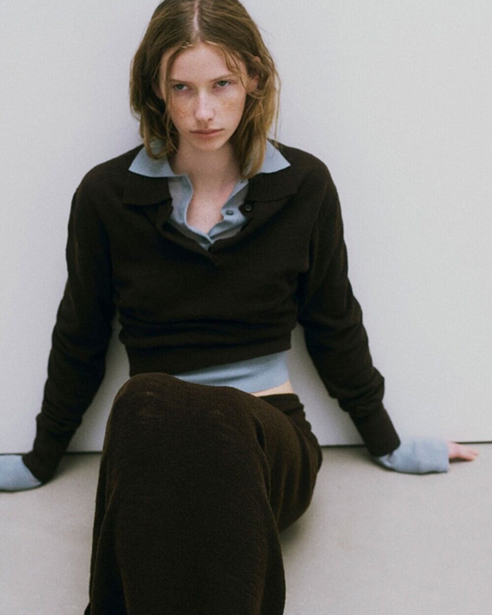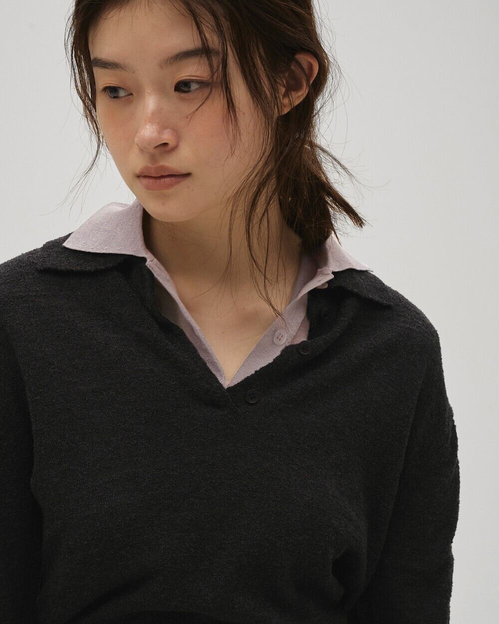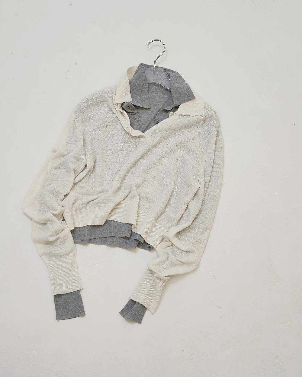 異なる糸を使用したレイヤードデザインがポイントのポロニット。配色がさりげないアクセントとなり、透け感のある編み地が軽やかさをプラス。それぞれ単品でも着用できるため、スタイリングに合わせたアレンジも可能。ほどよく抜け感のあるシルエットが、ナチュラルでこなれた雰囲気をプラスする一枚です。