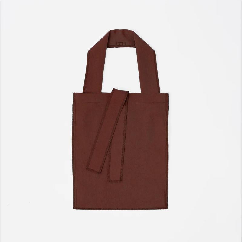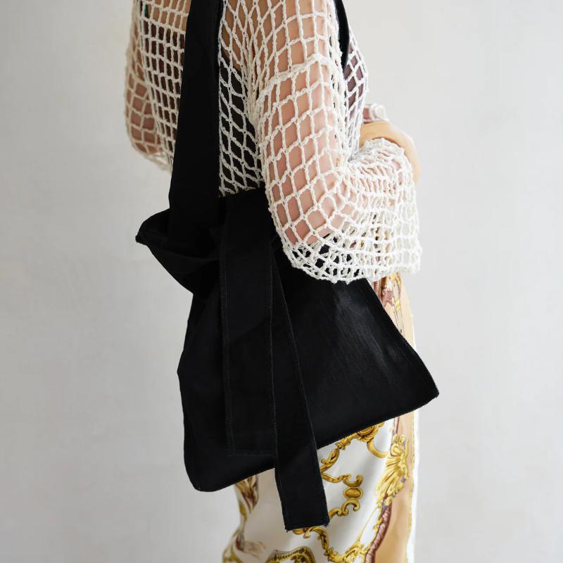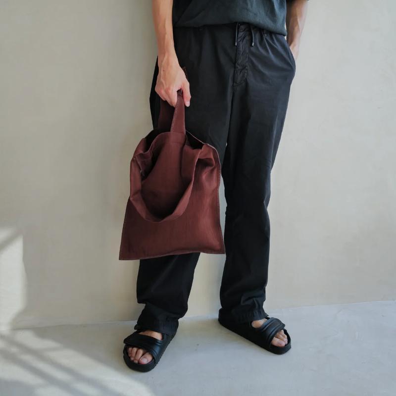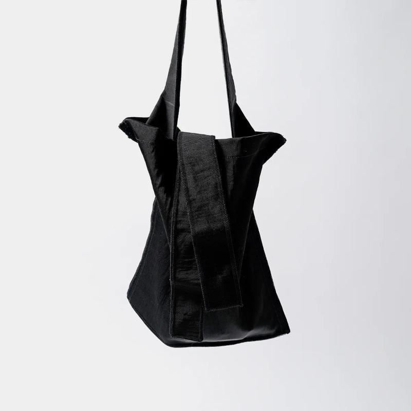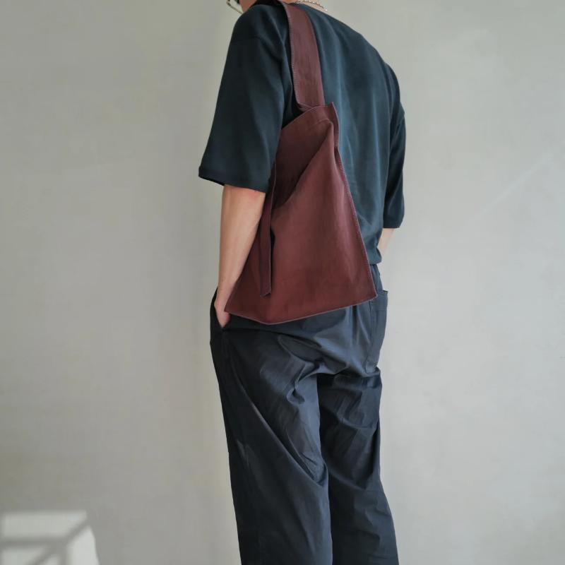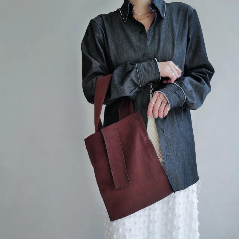 裏返したようなデザインが特徴的なワンショルダートートバッグ。S、M、Lの3サイズ展開のSサイズです。ウェアを製造する縫製工場にバッグの仕様を依頼することで、バッグメーカーにも服メーカーにも無い、類を見ない空気感漂うアイテムに仕上げています。