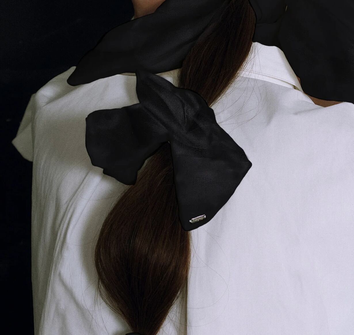 ミディアムサイズのスクエアシュシュは、スクエアの生地が折り重なって、リボンのような印象的なバックスタイルに。