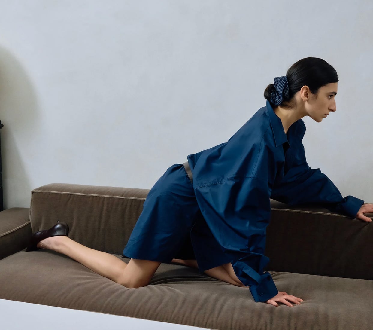 パジャマ風のチェック生地に大 きなロゴ刺繍を施したシュ シュ。 軽い素材感で、ヘアアレンジの アクセントに。