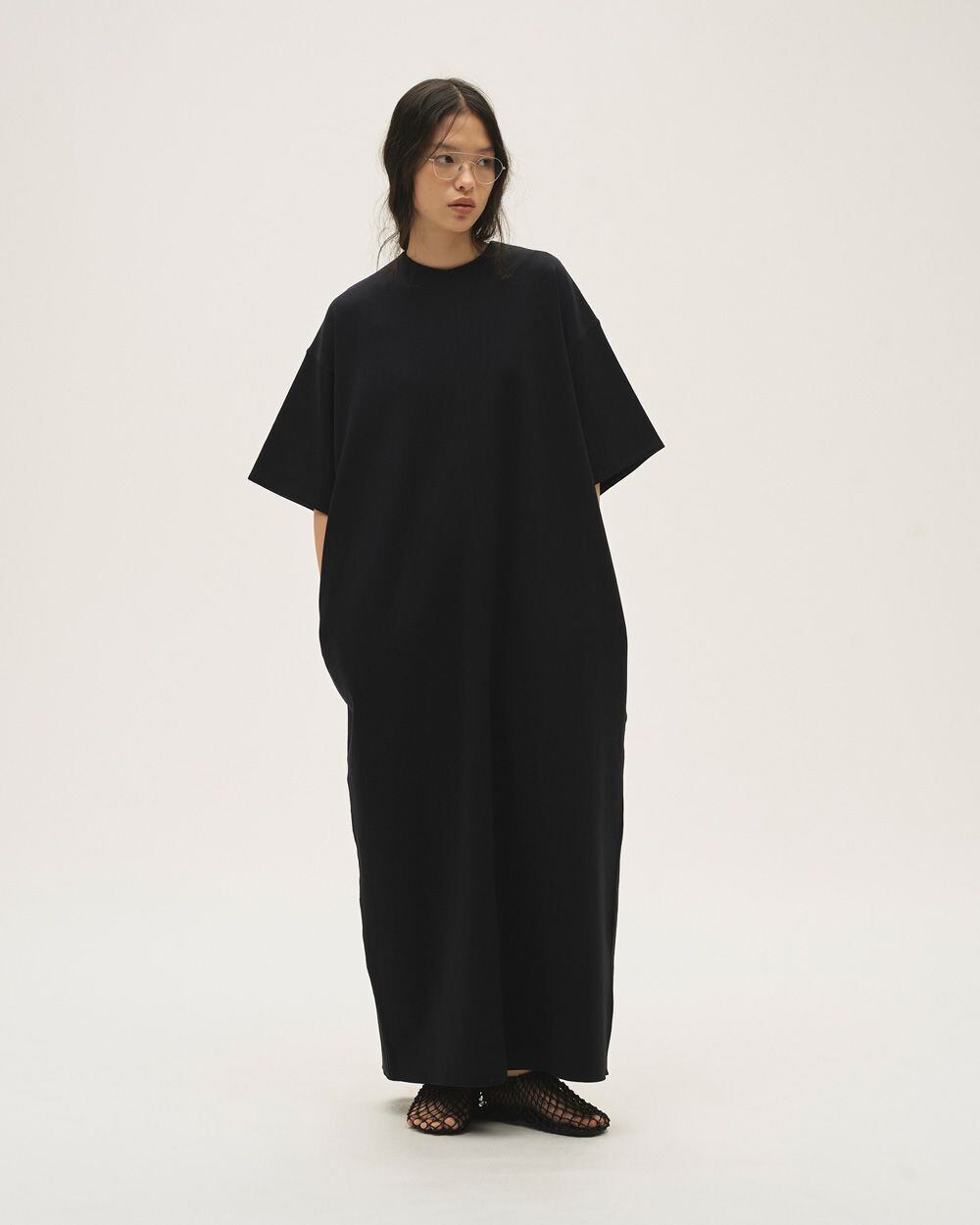 ほどよく肉厚で上質なカットソー生地を使用したドレス。身体のラインを拾わないゆったりとしたシルエットで、ラフに纏えるのに洗練された印象に仕上がる一枚。衿リブを省き、袖裏には薄い生地を重ねることで縫い代のステッチを見せないなど、ミニマルで上品なディテールも魅力。合わせる小物で幅広いスタイリングに馴染みます。