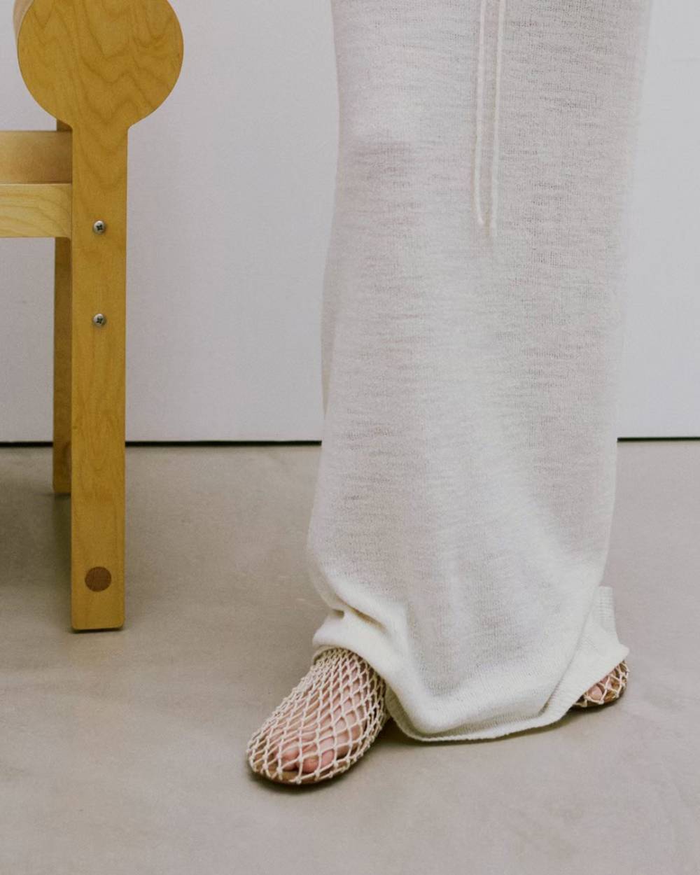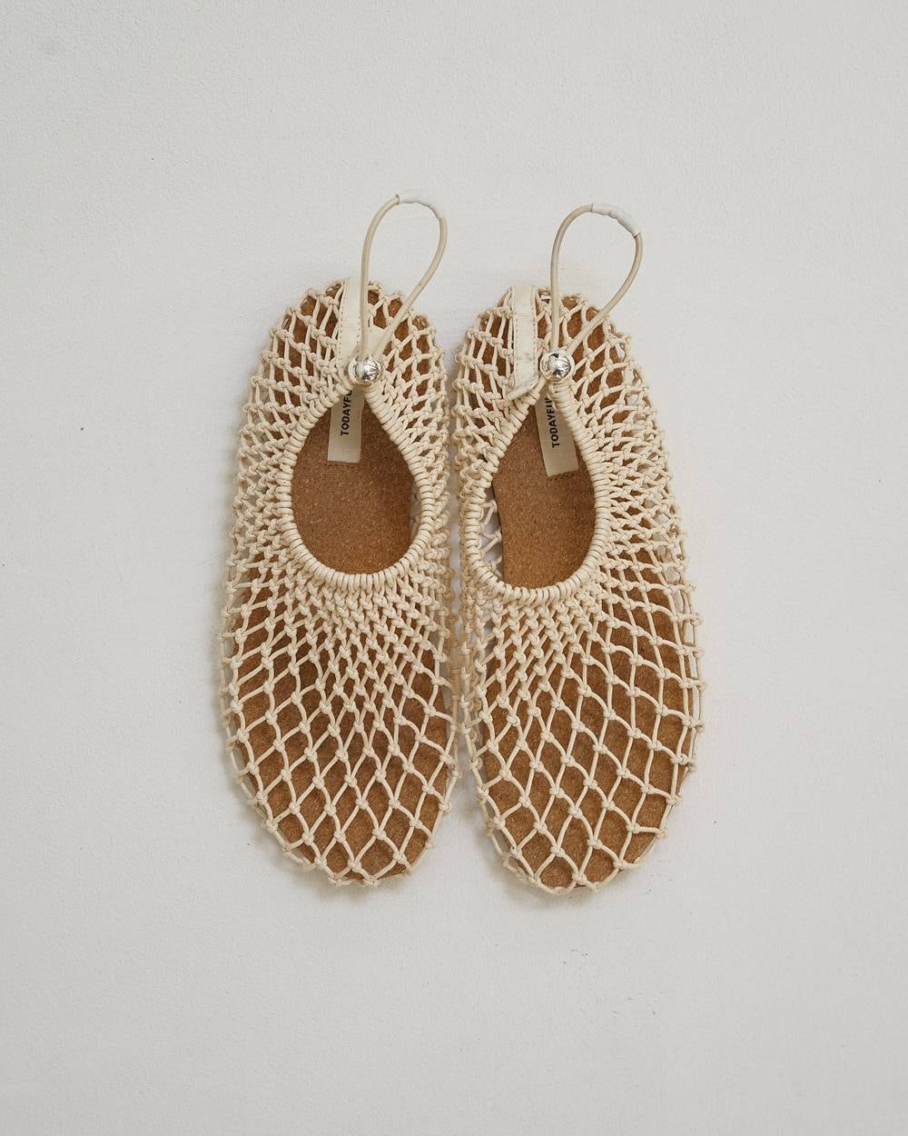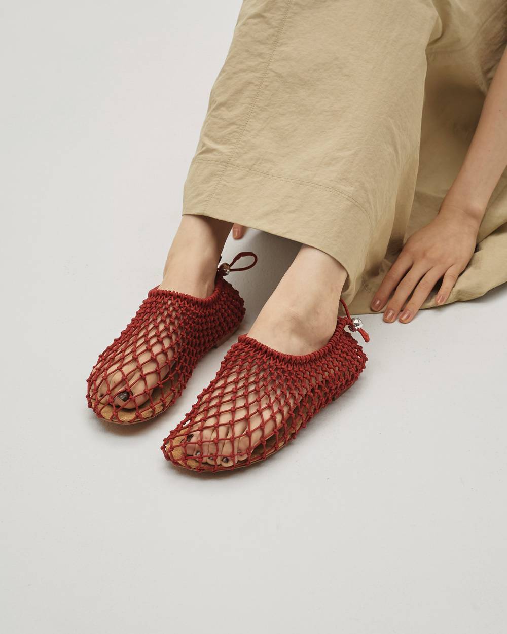 コード糸を手編みで編み上げたアッパーが印象的なスリッポン。ドロスト仕様の履き口にあしらったメタルパーツが、ミニマルなデザインにさりげないアクセントをプラス。シンプルなスタイリングに合わせるだけで、抜け感とこなれた雰囲気を演出します。