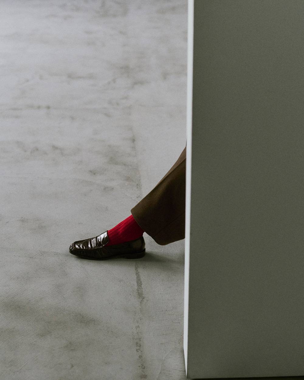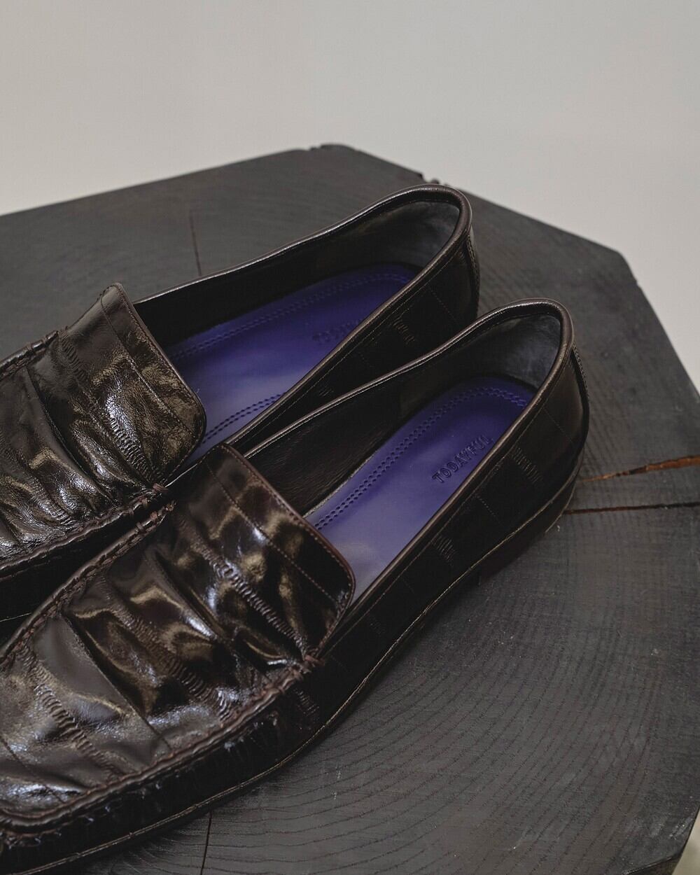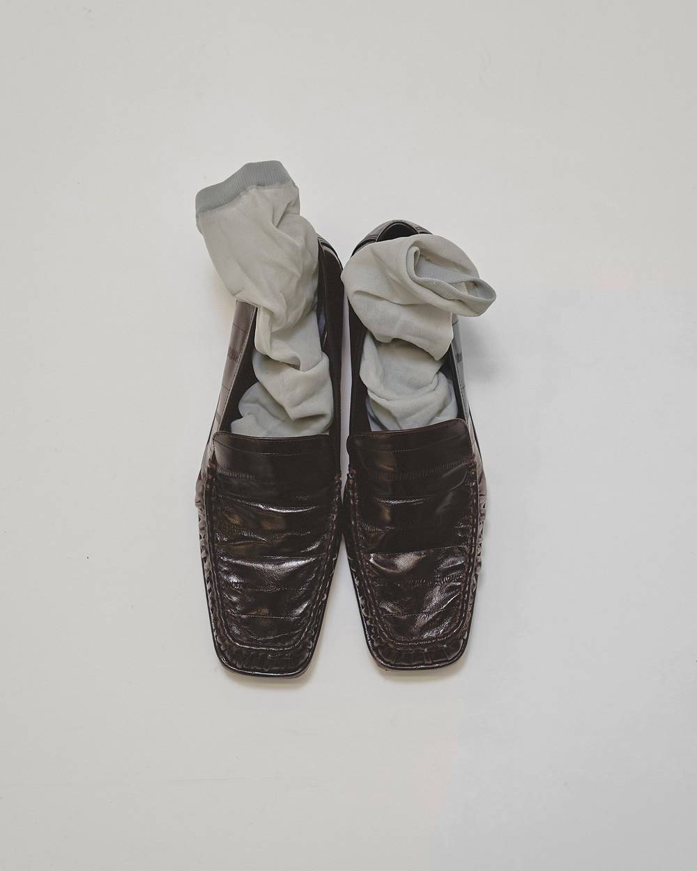 特殊な加工を施した牛革を使用したローファー。上品な光沢のある表情感豊かな牛革にふんだんにあしらったギャザーやステッチワーク、柔らかな履き心地が魅力。色味に奥行きのあるダークブラウンカラーで、ボトムス合わせはもちろん、ソックスを合わせたワンピースやスカートスタイルにも馴染みます。デイリーからオケージョンまで幅広く活躍する一足です。