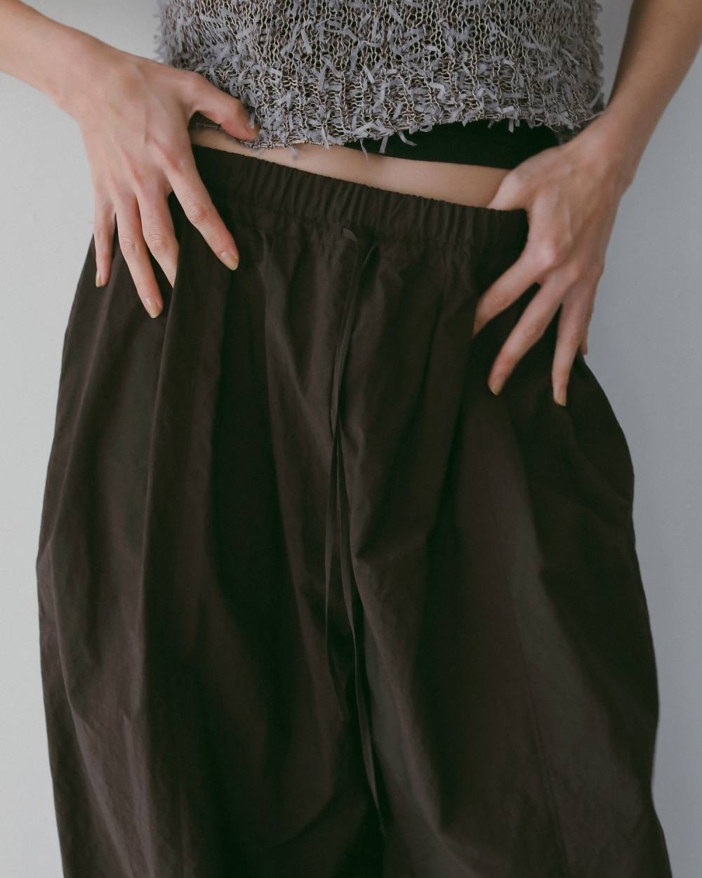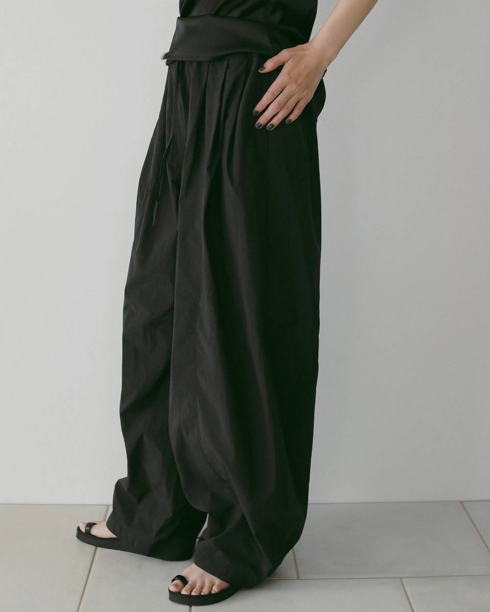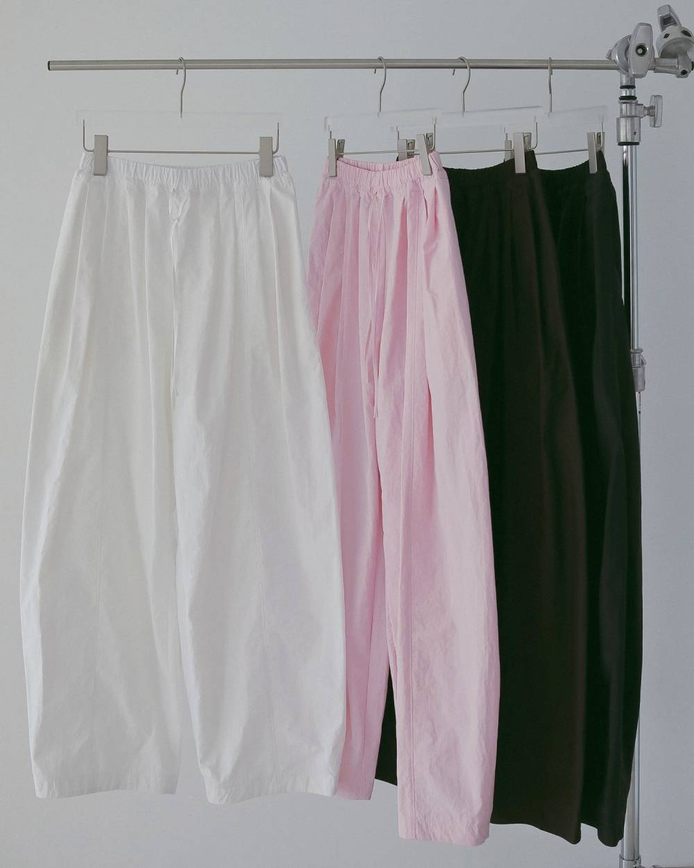 タックを4本入れ、たっぷりとボリュームを持たせたナイロンパンツ。丸みのあるフォルムが印象的で、スタイリングに存在感を添えながらも幅広いトップスと好相性です。ウエストは総ゴム仕様で、リラックス感のある穿き心地も魅力。フロントの切り替えに施したステッチがさりげなく縦のラインを強調し、ボリュームがありながらもすっきりとした印象に仕上げています。ベーシックに使いやすいブラックとホワイトに加え、こなれた雰囲気のブラウン、スタイリングを華やかに引き立てるピンクの4色展開。色違いで揃えたくなる、春夏のスタイリングに万能な一本。