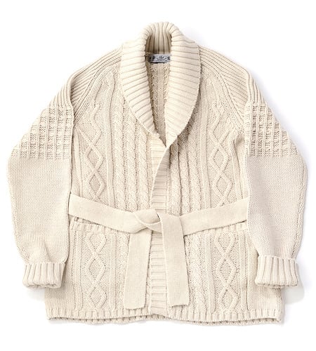 畦編み、リブ編みなど、様々な編地をパッチワーク的に配置。アランセータータイプのショールカラーのガウンカーディガン。ヘビーコットン製。